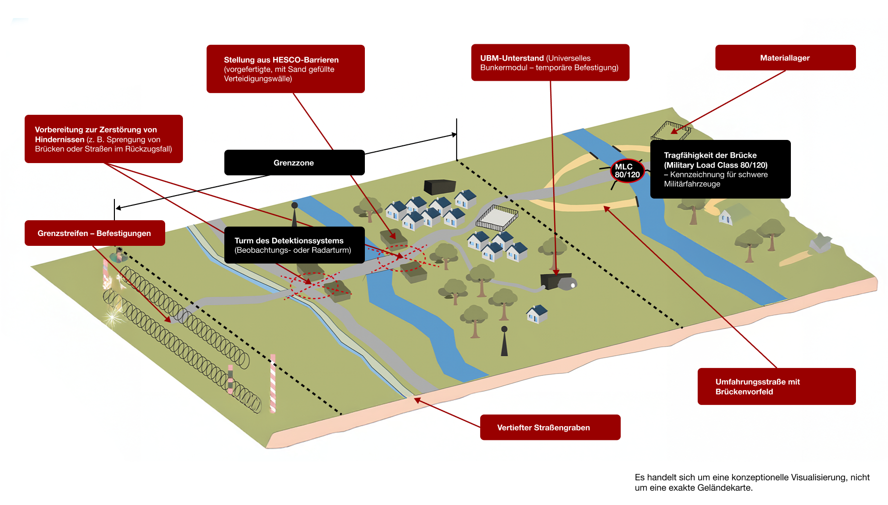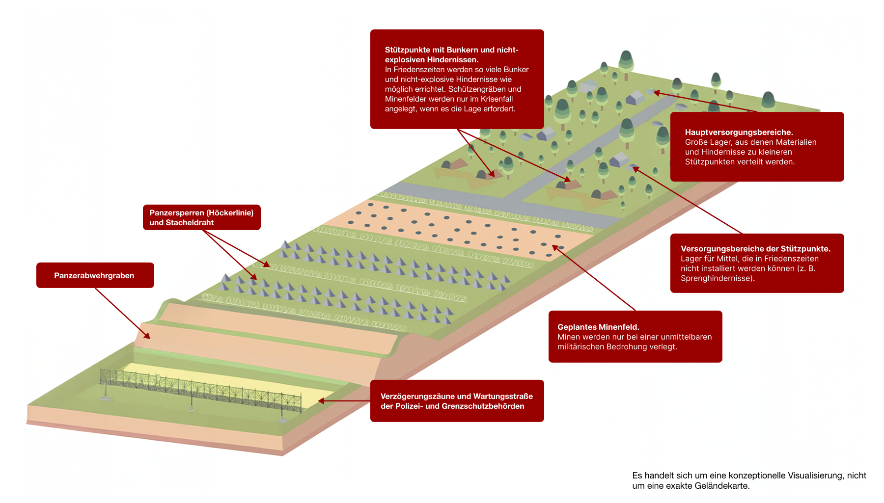 Obwohl auch die „Schaffung einer geeigneten Infrastruktur für Drohnenabwehrsysteme“ Teil des Projekts ist, soll die Verteidigungslinie erst 2028 fertiggestellt sein.