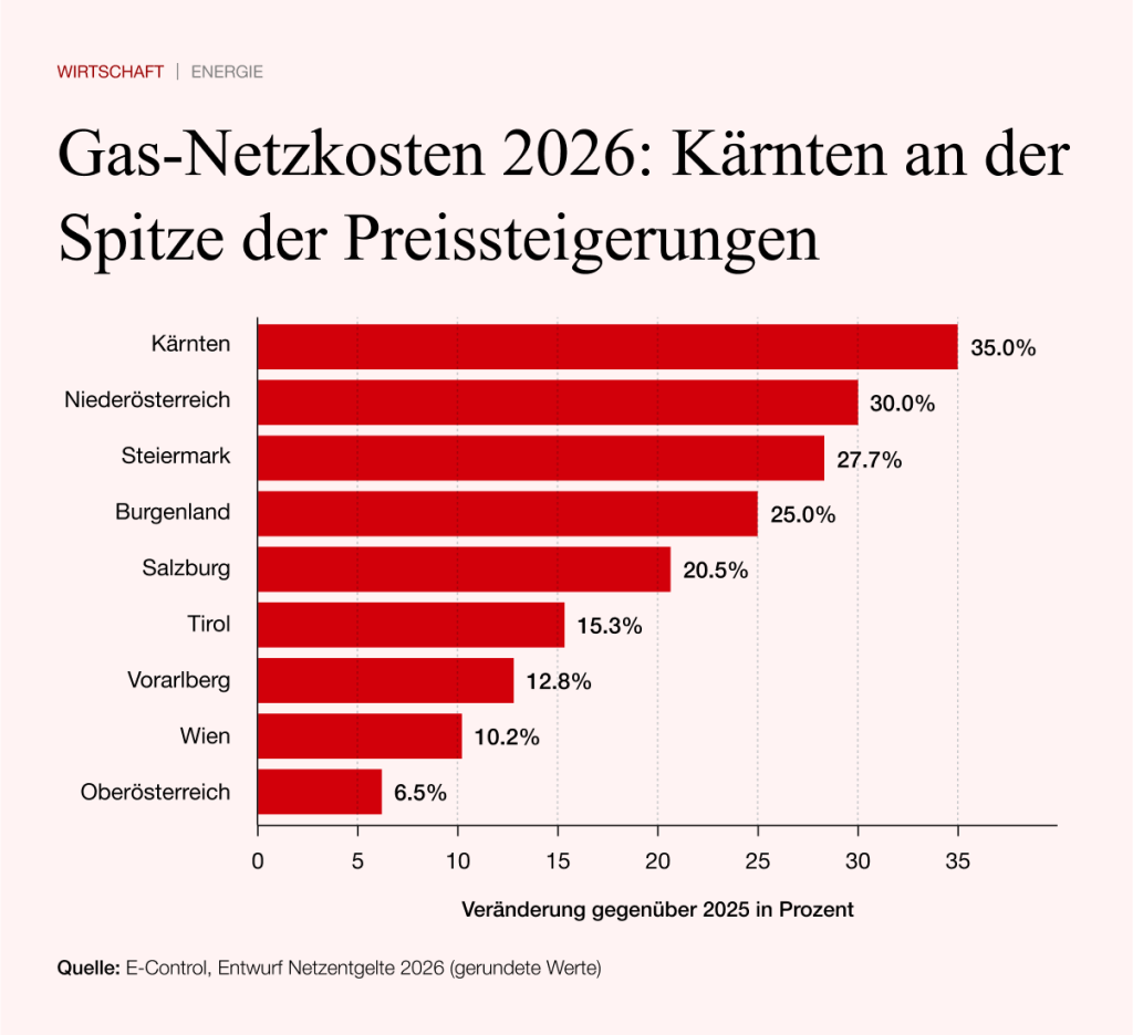 Die österreichische Regulierungsbehörde E-Control hat ihren Entwurf für die Netzentgelte 2026 vorgelegt – mit brisanten Zahlen. Demnach sollen die Gas-Netzkosten ab 1. Jänner im landesweiten Durchschnitt um 18 Prozent steigen. Besonders stark betroffen sind Kärnten (+35 %), Niederösterreich (+30 %), Steiermark (+27,7 %) und Burgenland (+25 %). Lediglich in Oberösterreich fällt der Aufschlag mit 6,5 Prozent vergleichsweise moderat aus.