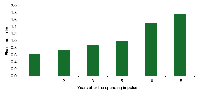 Die wichtigste Erkenntnis ist, dass der fiskalische Multiplikator langfristig größer als eins ist, was bedeutet, dass jeder für die Verteidigung ausgegebene Dollar die Wirtschaft um mehr als einen Dollar vergrößert.