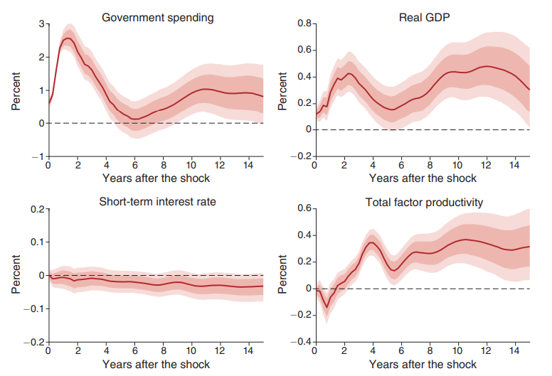 In einer in diesem Jahr von Juan Antolin-Diaz und Paolo Suric durchgeführten Studie wurde ein umfassender Datensatz zu 125 Jahren staatlicher Verteidigungsausgaben und deren Auswirkungen auf die US-Wirtschaft zusammengestellt, der es ihnen ermöglichte, die sehr langfristigen Auswirkungen einer solchen Erhöhung der staatlichen Ausgaben für die Verteidigung und insbesondere für die Forschung und Entwicklung im Verteidigungsbereich zu bewerten.