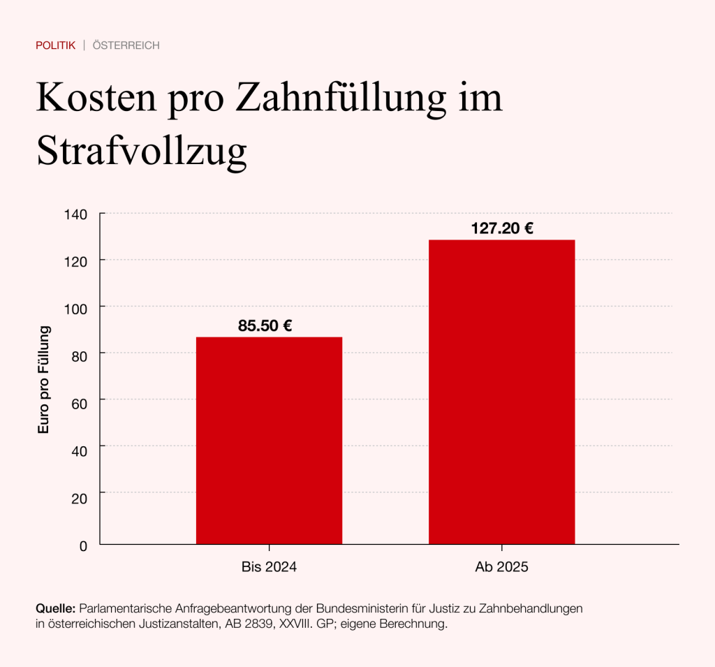 Allein im laufenden Jahr 2025 wurden in Österreichs Justizanstalten bisher 10.268 Zahnfüllungen bei Insassen durchgeführt. Grundlage dafür ist die gesetzliche Verpflichtung des Staates, die medizinische Grundversorgung sicherzustellen. Seit Inkrafttreten des EU-weiten Amalgamverbots müssen Zahnärzte jedoch auf teurere Materialien wie Silikat- oder Steinzementfüllungen zurückgreifen. Die Kosten pro Füllung stiegen dadurch von 85,50 Euro auf 127,20 Euro.