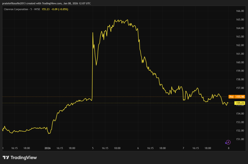 Die Antwort auf diese Frage gibt uns der Kurs und die Reaktion der Chevron-Aktien. Diese reagierten zunächst mit einem starken Anstieg von mehr als sechs Prozent. Die Zukunft schien rosig. Das amerikanische Unternehmen Chevron hat zudem immer noch einen Fuß in Venezuela. Das Unternehmen erhielt eine Ausnahmegenehmigung und blieb trotz der Verstaatlichung der Ölindustrie im Land.