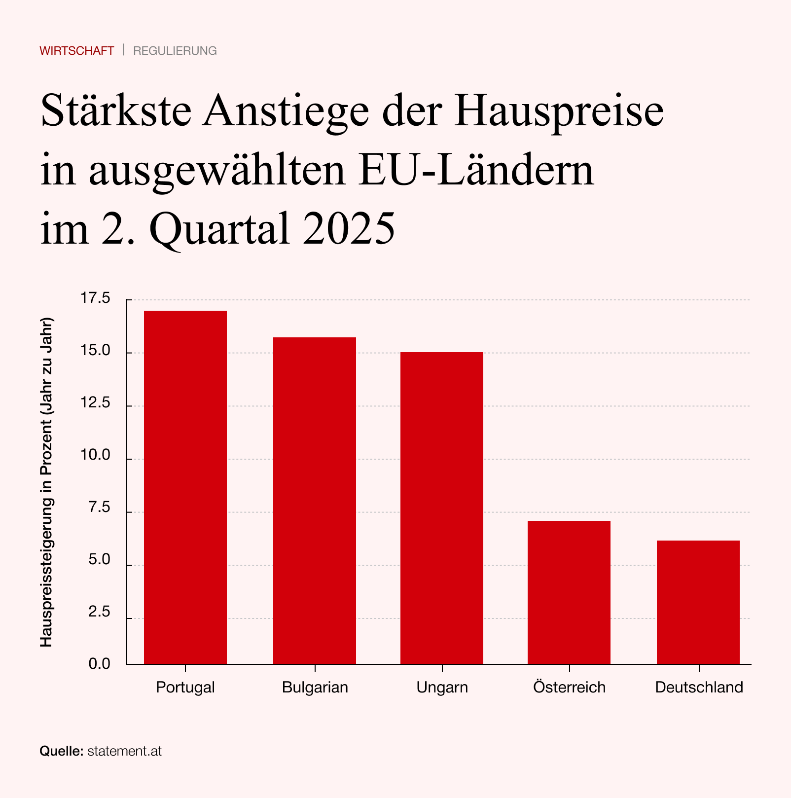 Wie unterschiedlich diese Mechanismen wirken können, zeigt der Blick auf die einzelnen Mitgliedstaaten. Besonders deutlich wird das am Beispiel von Portugal, Bulgarien und Ungarn. Im zweiten Quartal 2025 verzeichnete Portugal im Vergleich zum Vorjahresquartal einen Anstieg der Hauspreise um 17,2 Prozent. Bulgarien folgte mit 15,5 Prozent, Ungarn mit 15,1 Prozent. Damit lagen alle drei Länder deutlich über dem EU-Durchschnitt.