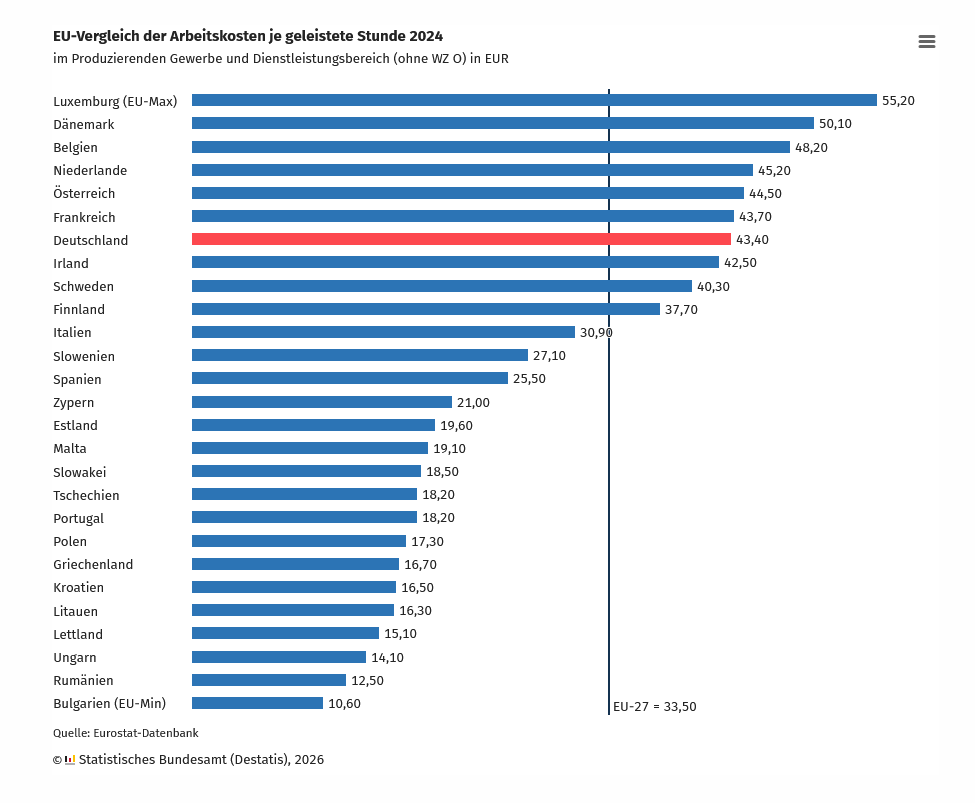 Deutschland belegt damit den siebten Platz in der EU, direkt hinter Frankreich (43,7 Euro) und vor Irland (42,5 Euro). Im Vergleich zum EU-Durchschnitt von 33,5 Euro sind die Kosten um 30 Prozent höher. Besonders im verarbeitenden Gewerbe, dem Rückgrat der deutschen Wirtschaft, liegen die Stundenkosten bei 48,3 Euro. Dieser Wert übertrifft sogar jenen der österreichischen Industrie (44,5 Euro).